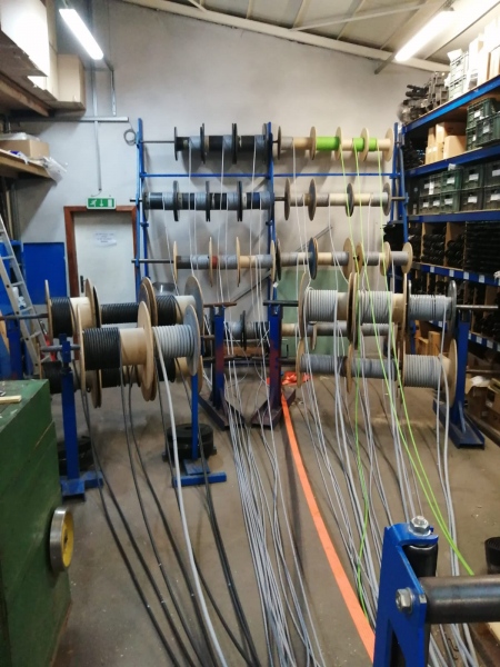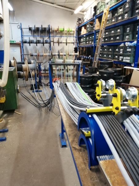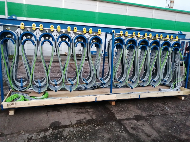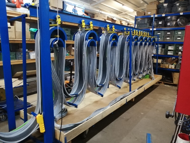 Realizacja ciekawego projektu zgodnie z wymaganiami Klienta - firana kablowa do suwnicy kontenerowej. Użyto 41 sztuk różnych kabli, długość magazynu wózków kablowych 5,1 metra.