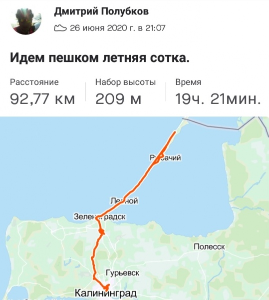 Nasi pracownicy są nie tylko profesjonalistami w swojej dziedzinie, ale również starają się dobrze bawić. Tak miło jest pospacerować po „zostanwdomu”. 26.06.2020 odbył się maraton spacerowy od miejscowości Morskoje na Kurszskej Kosie przez malownicze miejsca naszego regionu do Kaliningradu na 92,77 km, co zajęło 19 h 21 m. Tak trzymać Dima!