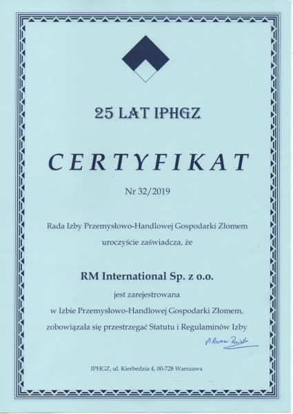 Nasza firma, będąc członkiem izby, otrzymała certyfikat i niezapomniany prezent na konferencji poświęconej 25-leciu Izby Przemysłowo-Handlowej Gospodarki Złomem.